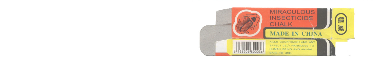 Illegal insect-killing chalk is imported from other countries and sold in small markets all over the United States. "Pretty Baby Chalk", "Chinese Chalk", or "Miraculous Chalk" are names for insecticides that looks like normal chalk, but they are intended to control small insects such as ants and cockroaches in homes. The chalk ingredients are usually unknown.